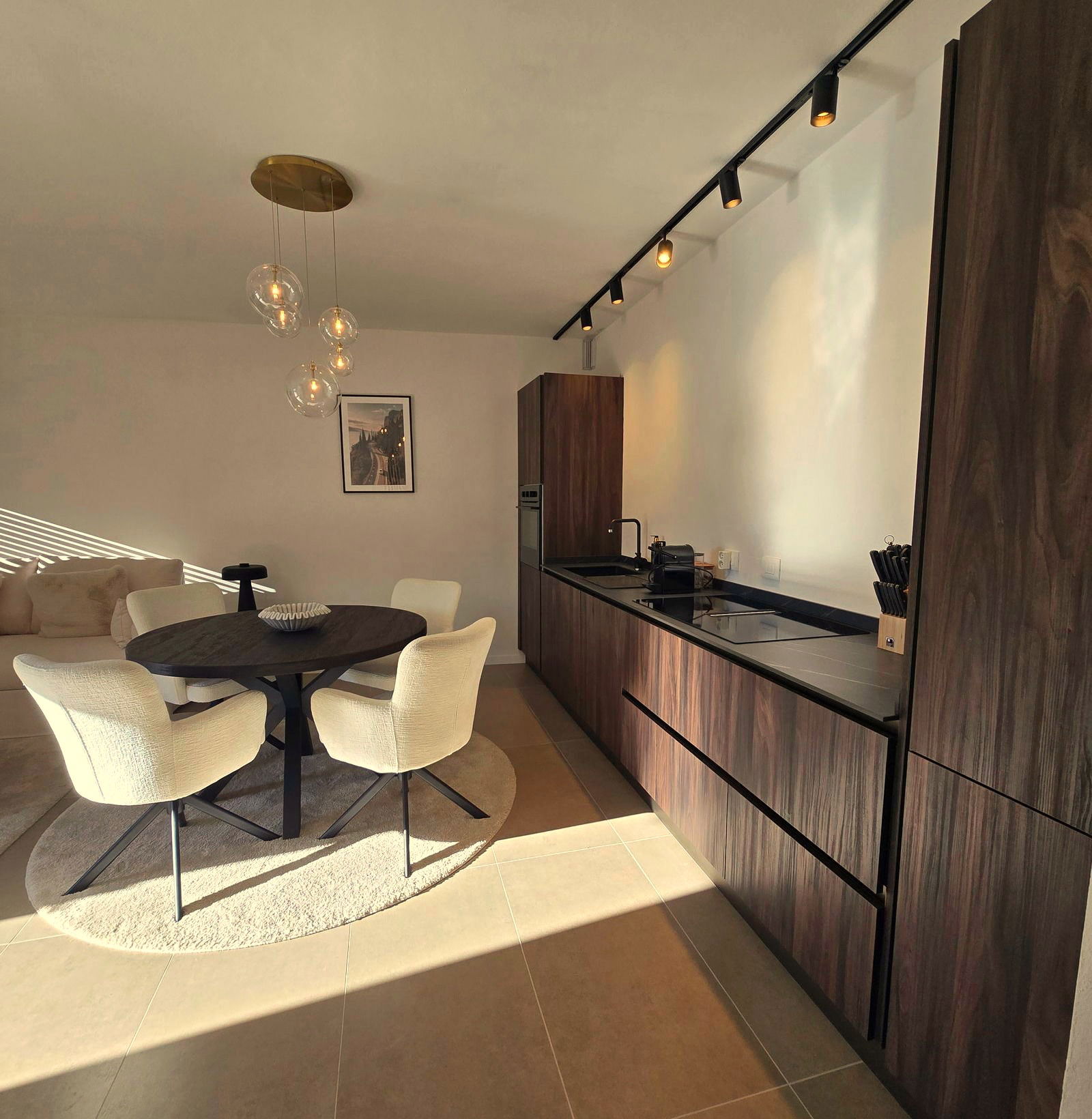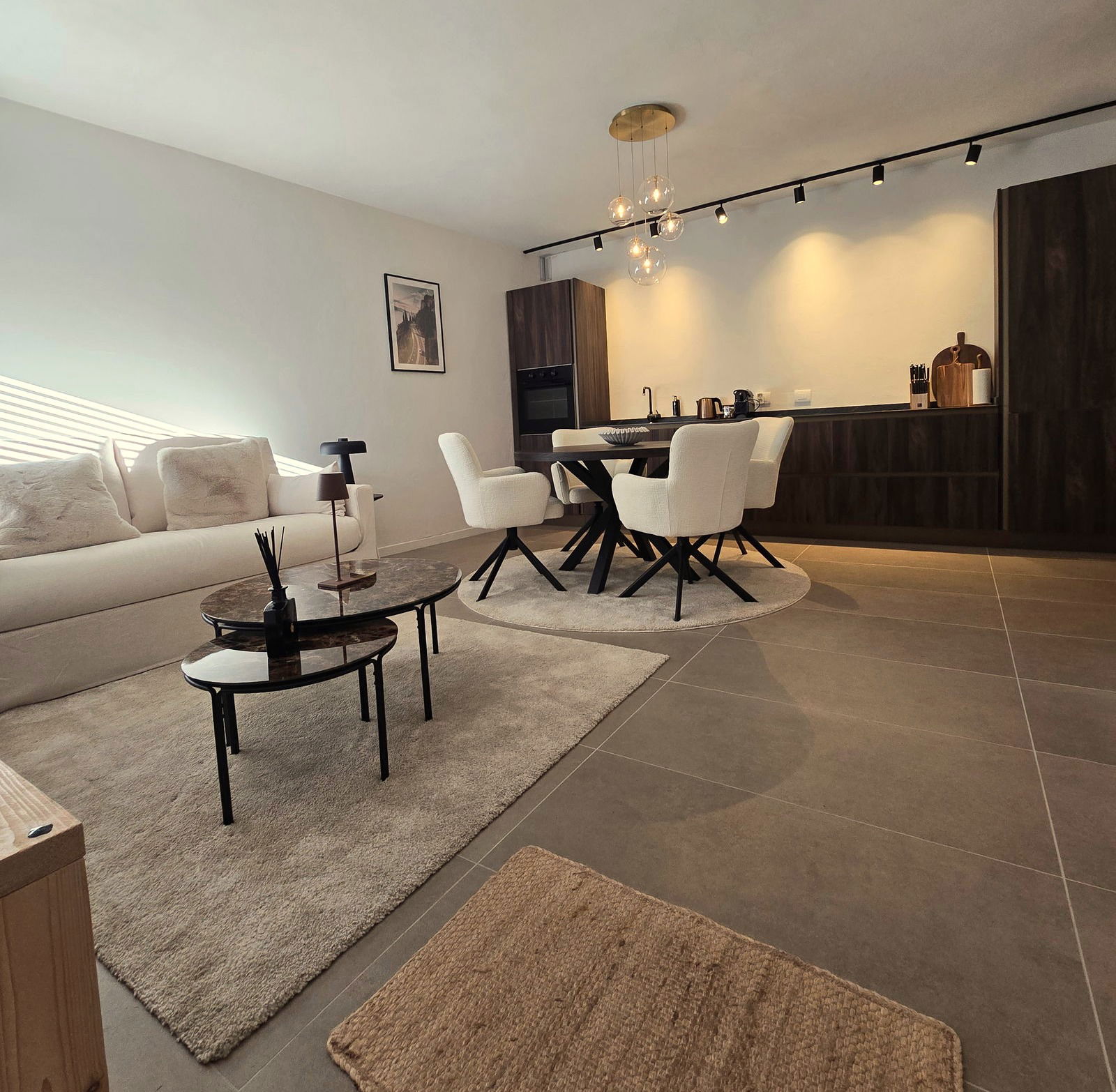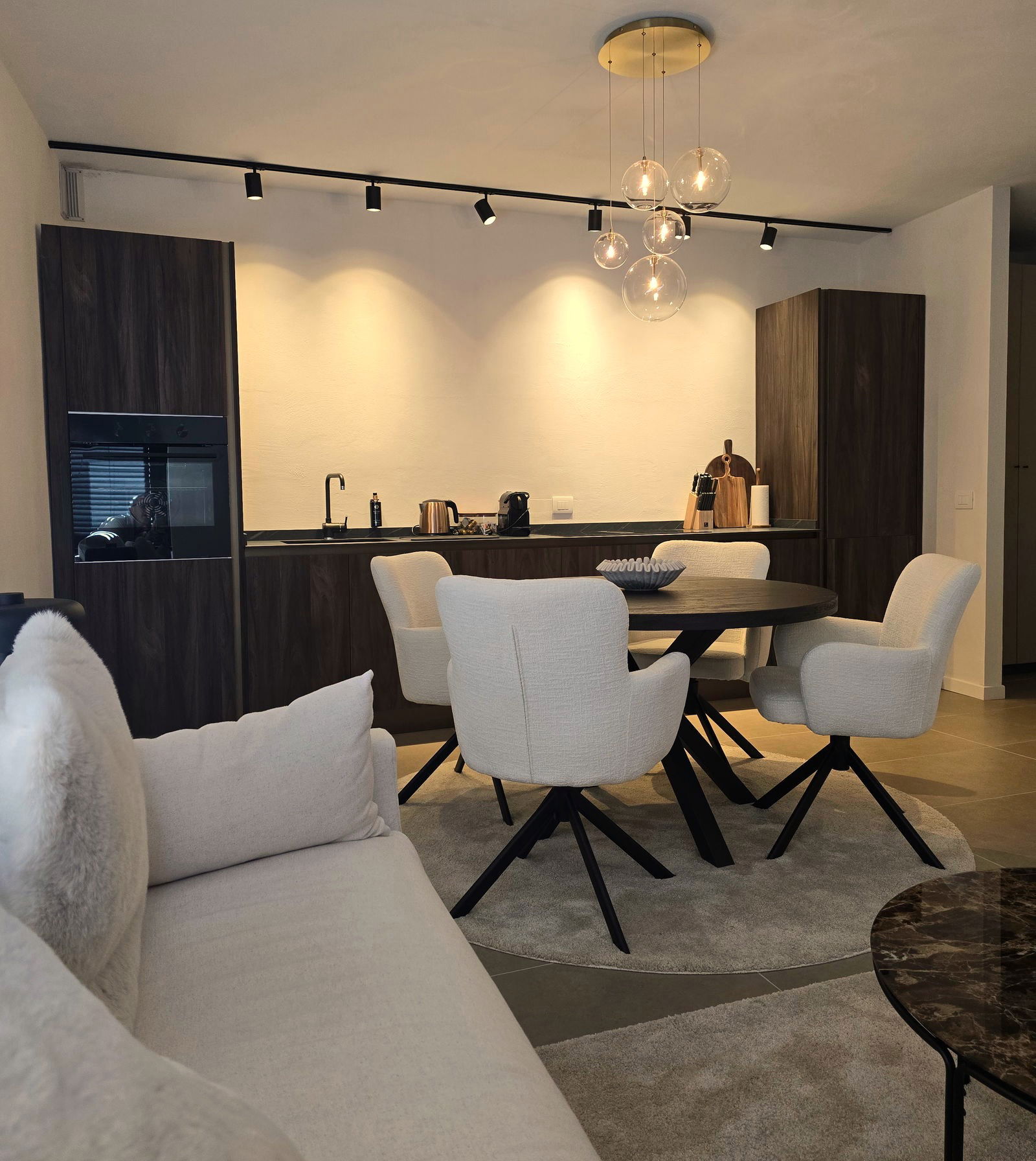 Het appartement zelf is modern en luxueus ingericht en voorzien van alle comfort. De volledig uitgeruste keuken beschikt over een oven, afwasmachine, koelkast met diepvries en alle nodige keukentools. Bij aankomst staan koffie en water voor je klaar – kleine details die het verschil maken. De badkamer is een echte eyecatcher, met een stijlvolle afwerking en een heerlijke regendouche.